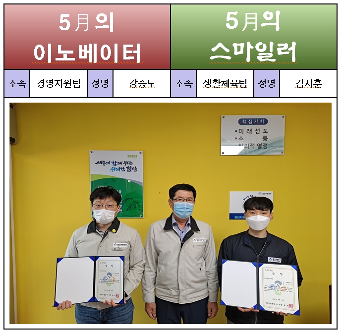 5¿ù 31ÀÏ ¿ì¸®°ø»ç ȸÀǽǿ¡¼´Â 5¿ù Çõ½Å ¹× Ä£Àý »ç¿ø¿¡´ëÇÑ ½Ã»óÀÌ ÀÖ¾ú½À´Ï´Ù. Çõ½Å»ç¿ø¿¡ ¼±Á¤µÈ °æ¿µÁö¿øÆÀ °½Â³ë ´ë¸®´Â °ø»ç ±×·ì¿þ¾î µµÀԿ°ú Á¤ÂøÀ» À§ÇÑ ¾÷¹«ÁøÇà, ±â¼úÁö¿ø µî ¾ÈÁ¤ÀûÀÎ Àü»êÈ ³ë·Â¿¡ ±â¿©°¡ Ä¿ ¼±Á¤ÇÏ°Ô µÇ¾ú½À´Ï´Ù. Ä£Àý»ç¿ø¿¡ ¼±Á¤µÈ&n..